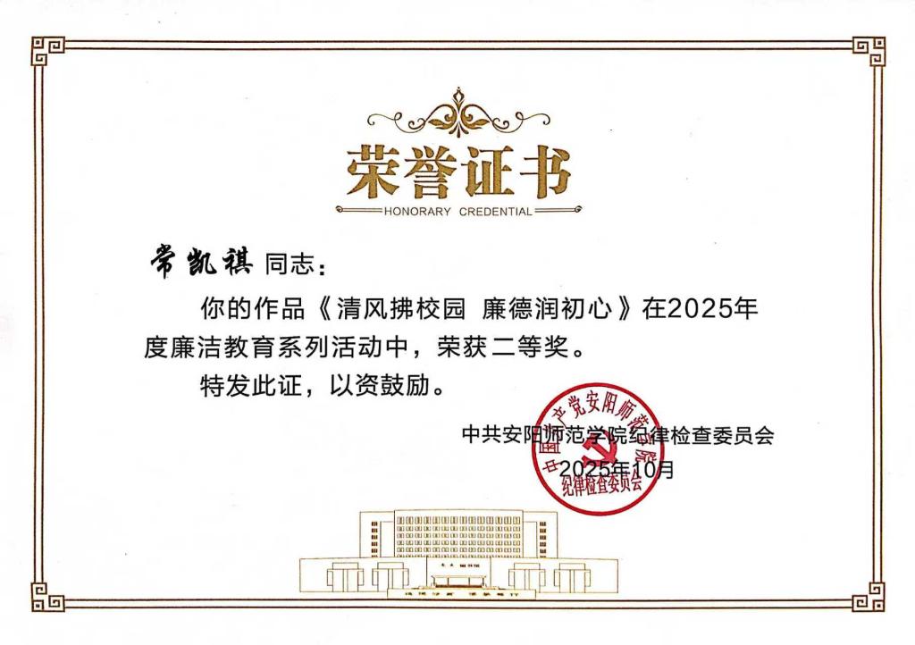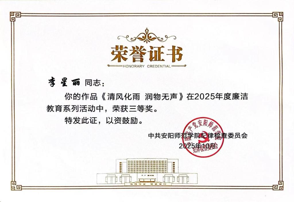 近日,在中共安阳师范学院纪律检查委员会组织开展的 2025 年廉洁教育系列活动中,法学院广大师生积极响应、踊跃参与,涌现出一批主题鲜明、形式多样、各具特色的优秀作品。其中法学院党委荣获优秀组织单位称号,2022级电子商务及法律专业二班常凯祺同学以《清风拂校园 廉德润初心》作品荣获二等奖,2022级电子商务及法律专业一班李星丽同学和2024级法学专升本一班付佳欣同学分别以《清风化雨 润物无声》《规矩里的温度》作品荣获三等奖。