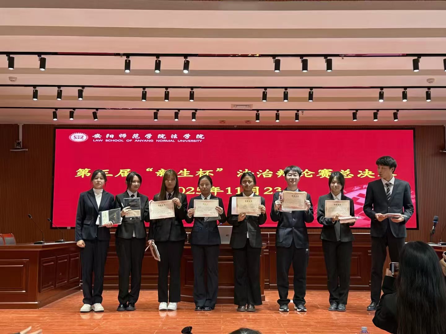 在比赛过程中,辩手们思路清晰,慷慨陈词,观点鲜明、论据充分,展现出了强大的辩论实力,用严谨的逻辑推理、出色的语言表达和高超的辩论技巧赢得现场观众阵阵掌声。两支辩论队在经过立论陈词、驳论申辩、质询小结、自由对辩、总结陈词几个环节的激战后,评委对每一位辩手的优秀表现给予肯定与鼓励。最终,经过评委们的认真评判,2025级社会工作一班代表队获得冠军,2025级法学三班代表队获得亚军。张婉莹、张明瑶、秦子铠、潘梦炎四位同学获得了“优秀辩手”称号。