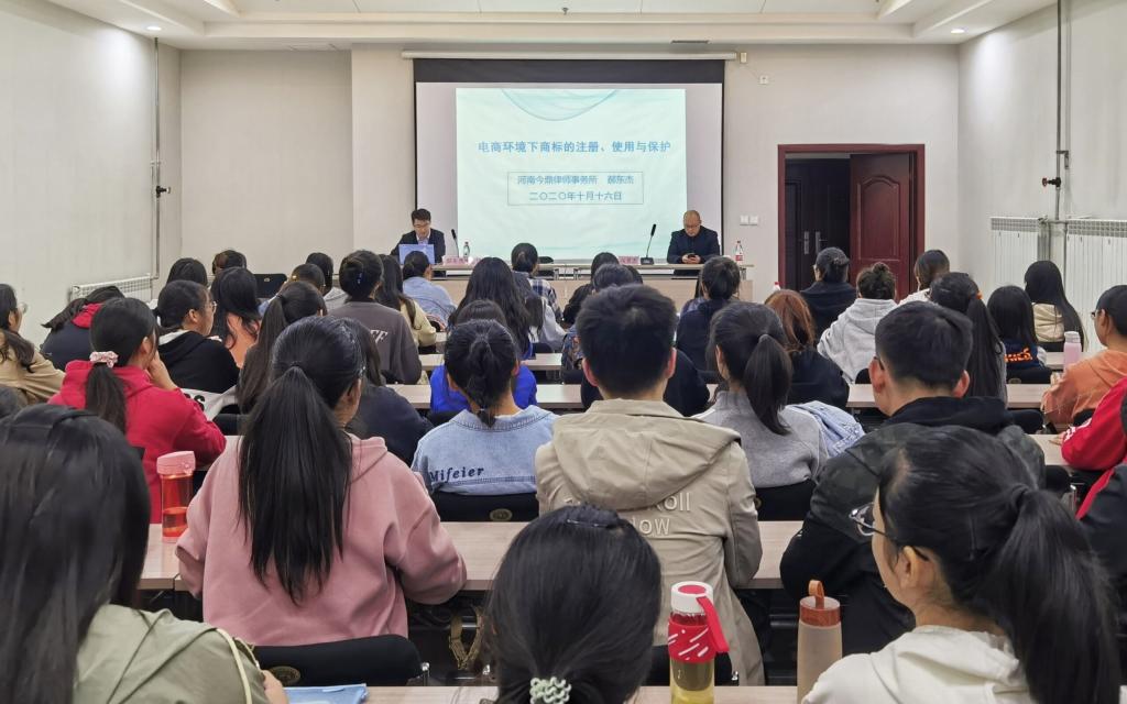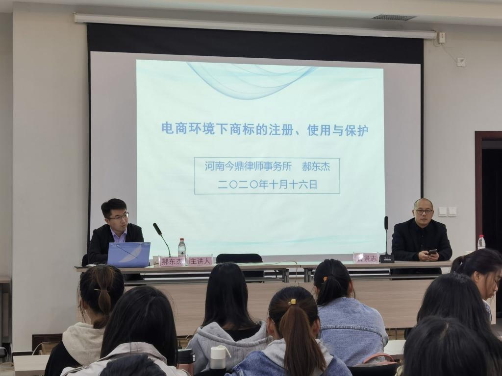 2020年10月16日下午,河南今鼎律师事务所合伙人郝东杰律师应邀到我校文博南楼五楼第二会议室做题为《电商环境下商标的注册、使用与保护》的实务讲座。讲座由谷景志老师主持,法学院部分老师和2019级电子商务及法律班全体同学参加。