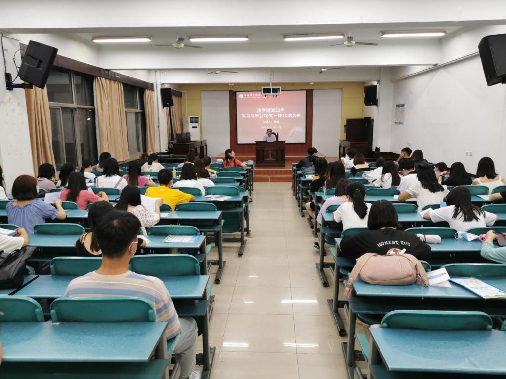 2020年9月7日晚,法学院2021届毕业生毕业实习与毕业论文一体化动员会在和义楼116室召开。会议由胡伟副院长主持,根据学校疫情防控的要求,2017级法学本科专业、2017级电子商务及法律专业共176名学生分五批次参加本次会议。会上,胡伟副院长传达了学校教务处关于毕业实习与毕业论文一体化工作的文件精神,解读了毕业实习和毕业论文的教学规划,并根据学校教务处关于毕业实习与毕业论文一体化工作的具体安排,详细说明了法学院2021届毕业生毕业实习和毕业论文的工作规划和要求。