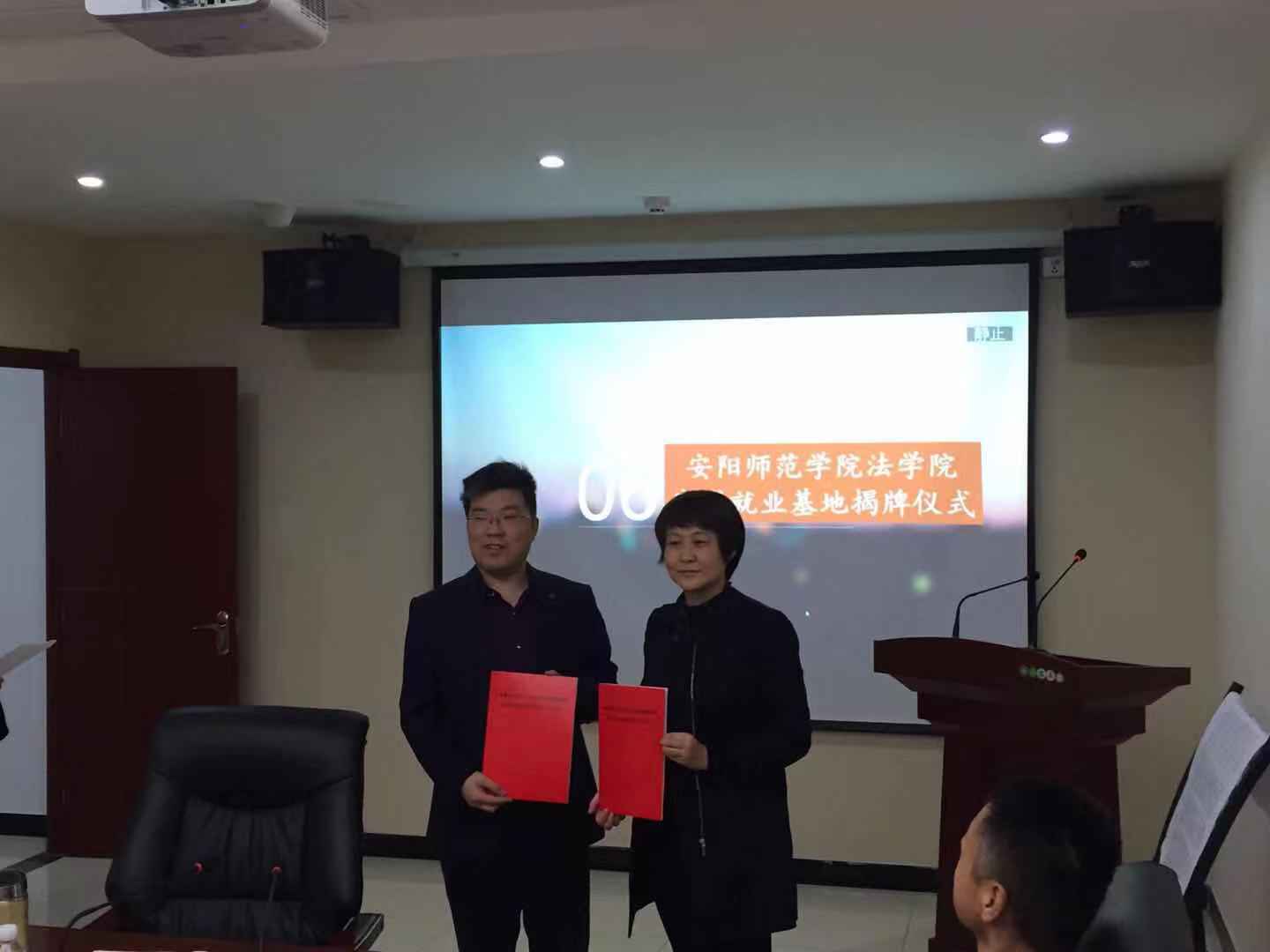 2018年10月18日下午,安阳师范学院法学院与河南毅刚律师事务所建立实践就业基地合作签约和揭牌仪式在河南毅刚律师事务所举行。法学院党委副书记张蕊、副院长冯凡英和胡伟、李明璗、张国强、黄斐老师以及河南毅刚律师事务所主任王毅刚等律师参加了仪式。