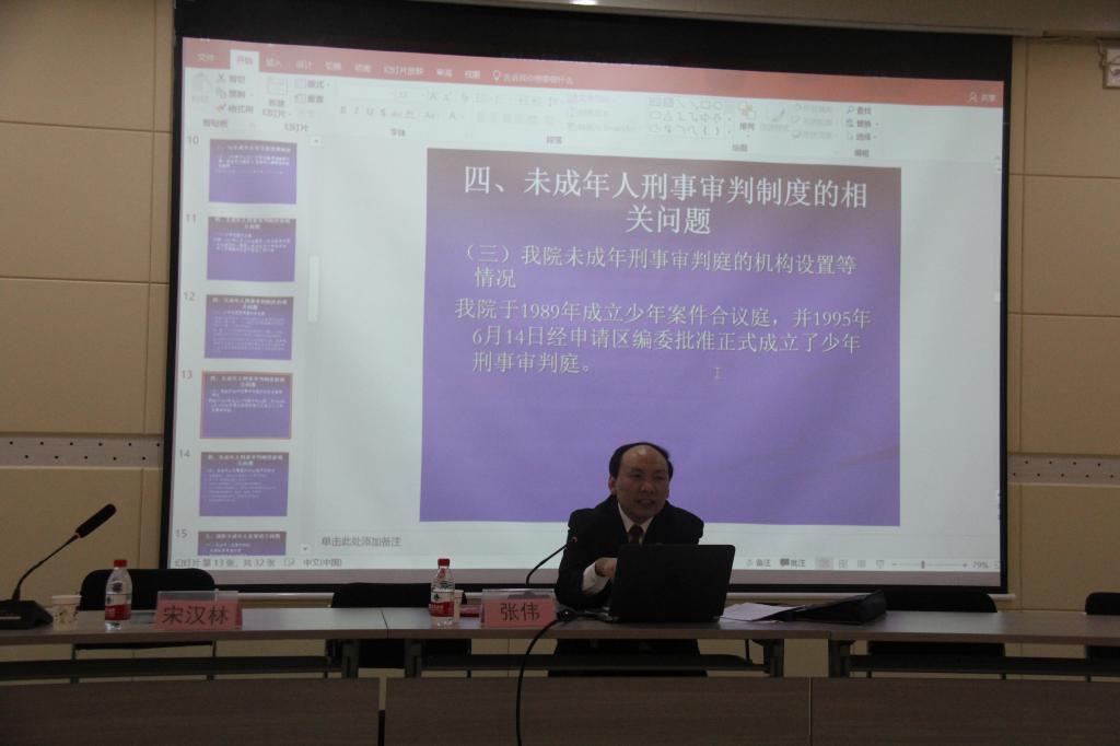 2018年4月12日,晚上18时30分,法学院于文博楼五楼第一会议室开展了以未成年刑事案件审判的若干问题为主题的法官讲座。法学院副院长宋汉林,文峰区人民法院法官张伟出席了本次讲座,法学院17级法学专业和专升本的部分同学参加了本次讲座。