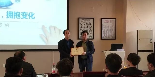 讲座开始前,我院王俊生书记为陈勇先生颁发了"安阳师范学院电子商务及法律专业创业导师"聘书。
