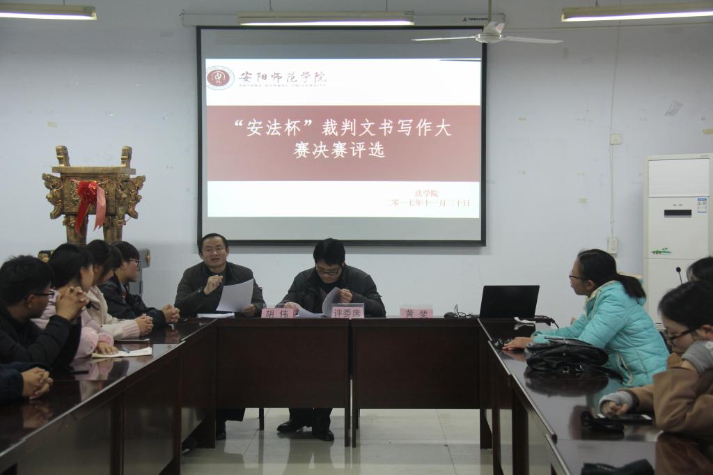 11月30日下午5点,安阳师范学院法学院主办的裁判文书比赛的最后评比在和容楼A336会议室圆满结束。法学院胡伟老师、黄斐老师出席了本次活动,担任评委,会议由党建办信息部贺苗主持。