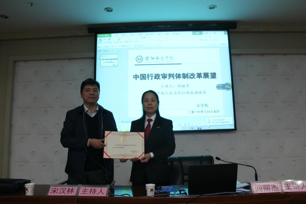 10月19日晚,安阳市中级人民法院行政庭副庭长阎丽杰法官做客法学院法官实务讲坛,作了题为《行政诉讼审判体制改革展望》的报告。法学院2015级、2016级本科学生150余人参加了报告会,报告会由法学院副院长宋汉林博士主持。