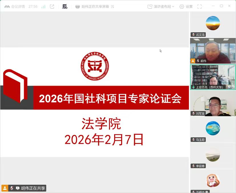为助力我院教师申报2026年度国家社科基金项目,2026年2月7日下午,我院通过腾讯会议线上形式,组织召开了“2026年度国家社科基金项目专家论证会”,苏州大学教授、博士生导师上官丕亮对我院教师预申报的2026年度国家社科基金项目进行了专业指导。会议由刘军奎院长主持,学院预申报2026年度国家社科基金项目的教师参加了此次论证会。