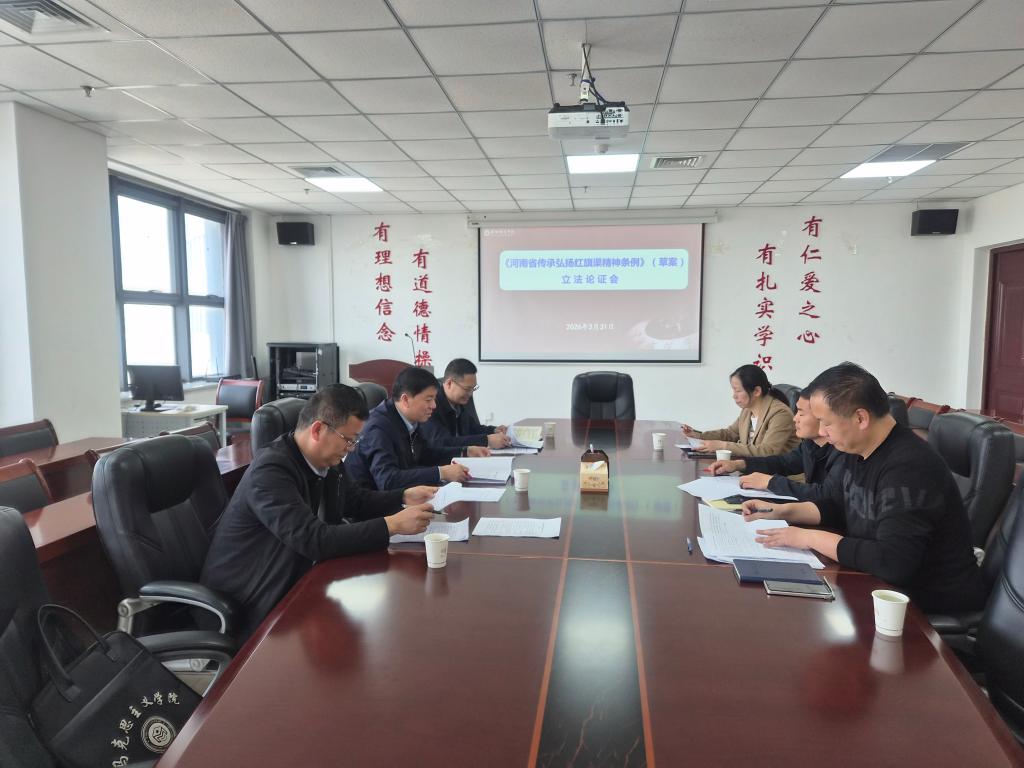 2026年3月31日,法学院在3B412会议室组织召开《河南省传承弘扬红旗渠精神条例(草案)》立法论证会,研究生处处长宋汉林教授、法学院院长刘军奎教授、马克思主义学院院长胡运锋教授、法学院张国强副教授、曲沛副教授和马克思主义学院邢继攀博士参加论证会。宋汉林教授主持论证会。